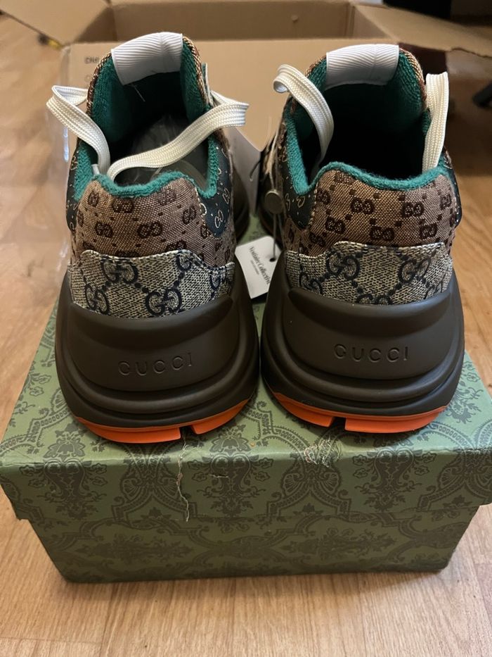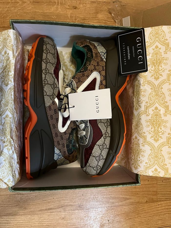 👟Baskets Gucci – modèle Rhyton (GG Supreme) • Je vends cette paire de baskets Gucci authentiques, en très bon état. • Modèle emblématique Rhyton, reconnaissable à sa semelle épaisse et son design rétro. ✨ Détails : • Marque : Gucci • Modèle : Rhyton • Matière : toile GG Supreme, empiècements en cuir et textile • Couleurs : beige / bordeaux / vert / gris • Semelle épaisse en caoutchouc • Lacets crème • Logo Gucci visible sur la languette et les étiquettes 👟 Pointure : • 42 mais taille grand plutôt 42,5 voir 43 📦 Inclus : • Boîte Gucci d’origine • Étiquettes d’origine (voir photos) 📏 État : • Très bon état, neuf • Jamais portées (voir photos pour plus de détails) N’hésitez pas à me contacter pour plus d’informations ou de photos supplémentaires 😊
