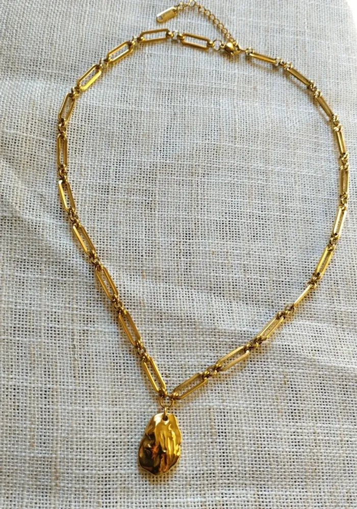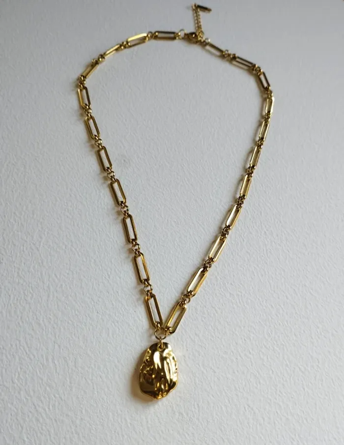 Collier doré en acier avec pendentif. Longueur : 41 cm + 4 cm d'extension.