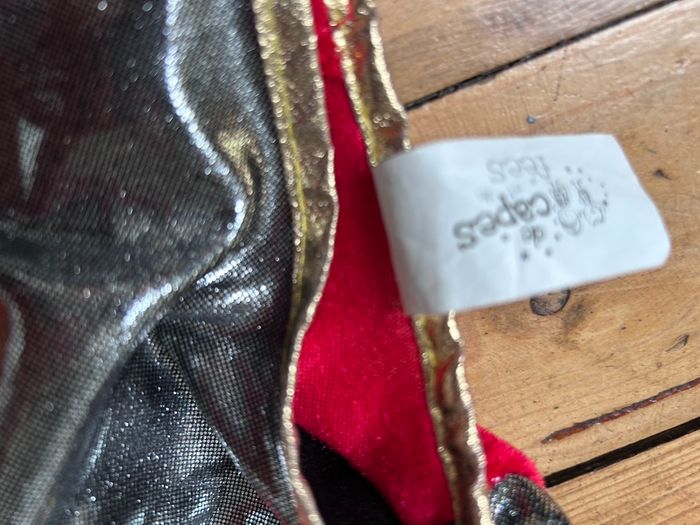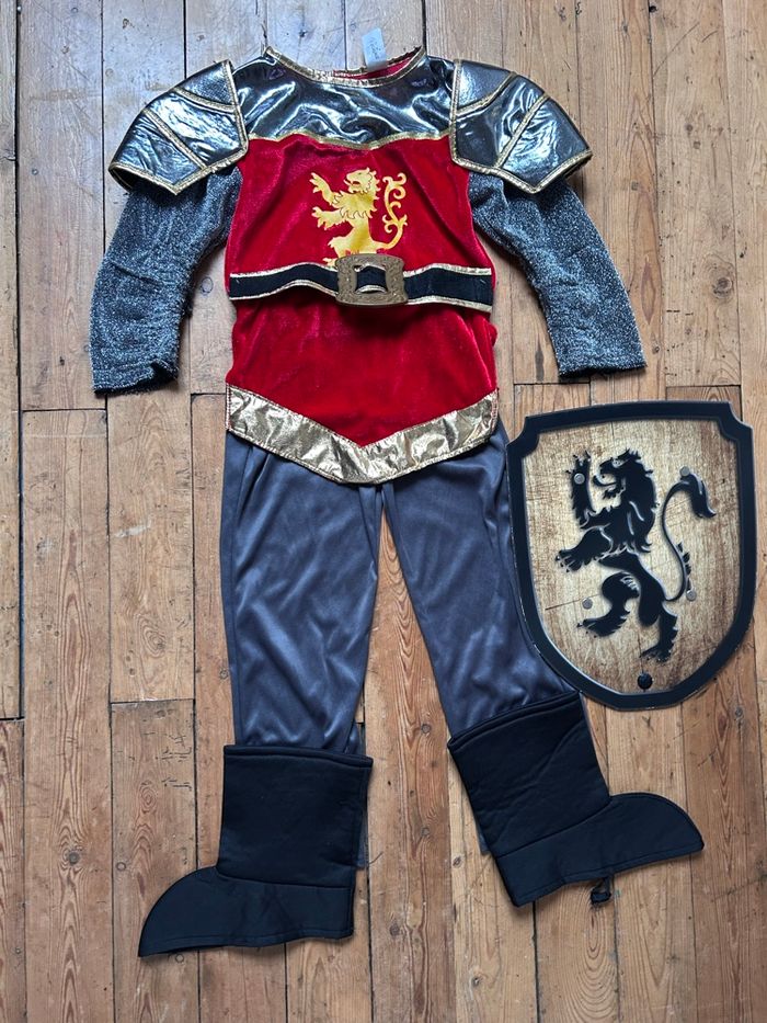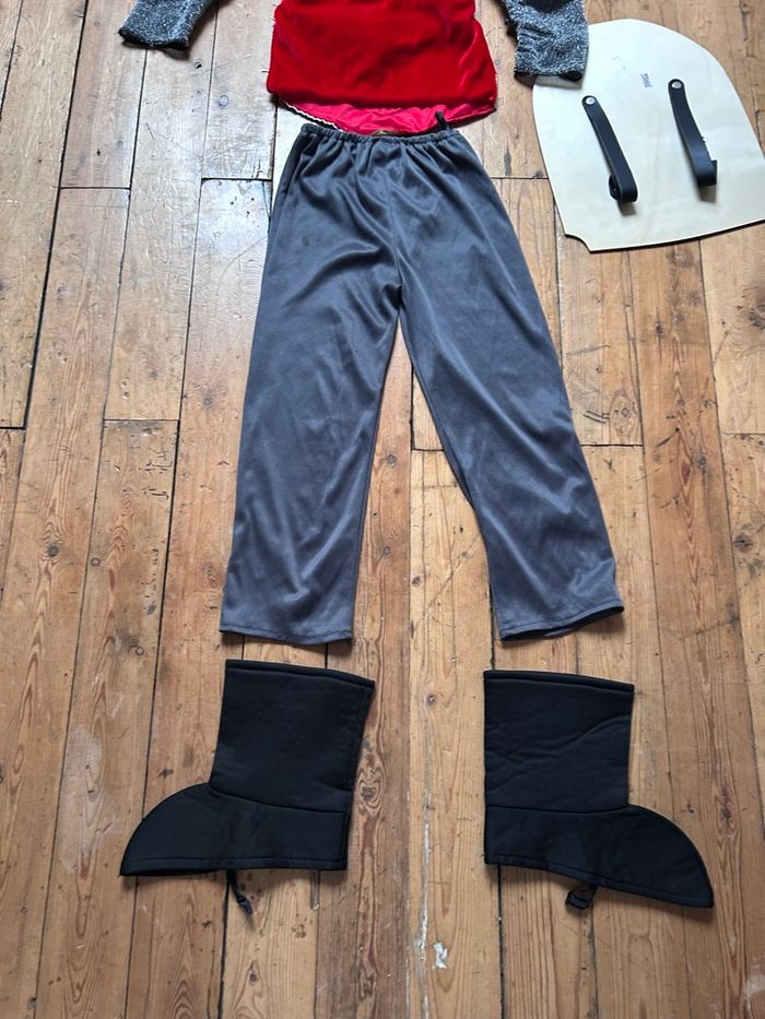 Déguisement médiéval chevalier Recomposé pour quelques pièces Taille 5 ans 110 cm Bouclier bois Protège bottes noir Pantalon gris polyester Tunique armure lion De capes et de fées