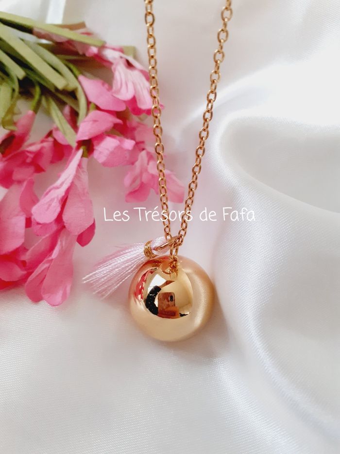 🤰 Bola de grossesse fait-main composé : - d'une chaîne en acier inoxydable doré d'une longueur d'environ 107 cm. - d'une boule sonore plaquée or de diamètre 20 mm. - d'un pompon rose.