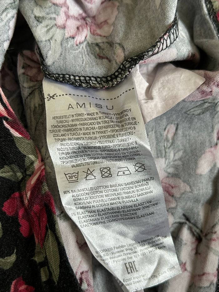 Joli haut fleuri à manches longues, de marque Amisu. Taille S. Porté plusieurs fois, en très bon état. aisselle à aisselle 38 cms à 45 cms épaule à épaule 36 cms et plus longueur manches 62 cms taille 35 cms et plus longueur depuis épaule 58 cms Le tissu est extensible 95% coton et 5% elasthanne