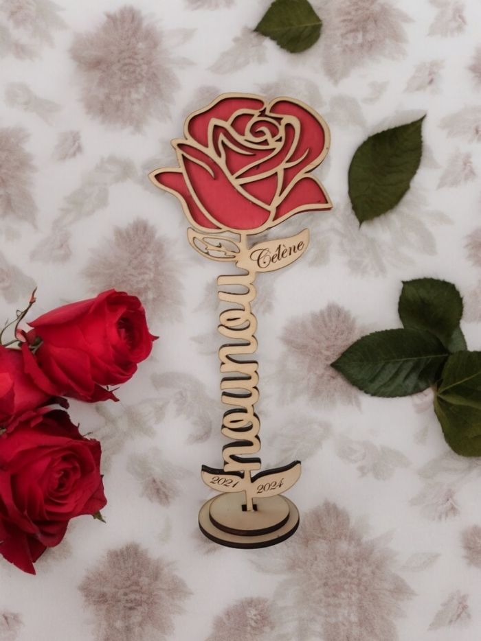 Rose en bois, rouge sur socle, hauteur 20cm Nounou sur la tige
