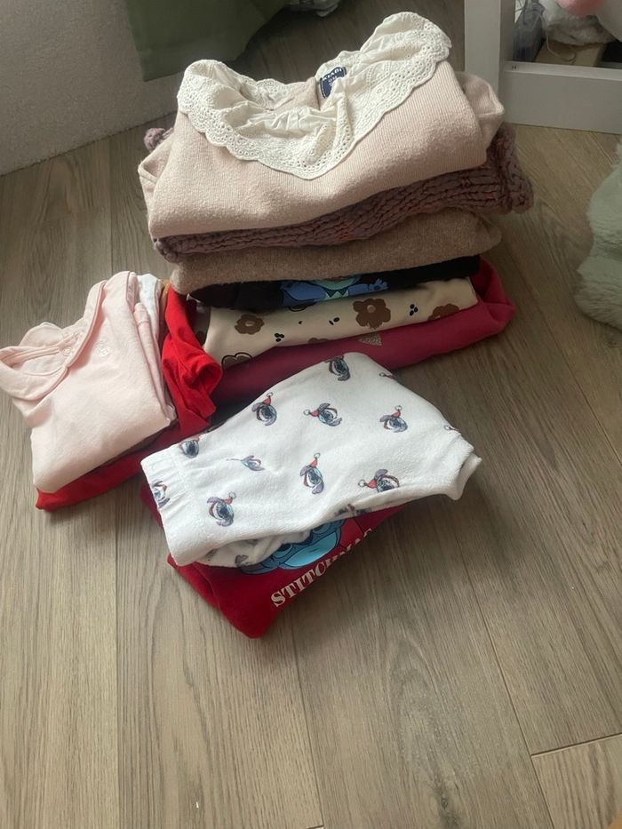 Bonjour, lot de vêtements de 12 mois fille vous avez toutes les photos de chaque article. Tout est en très bon état voir des fois jamais porté juste laver. 🔸3 maillots okaibi(rose, blanc, marron petit pois) 🔸1 maillot orchestra (rouge) 🔸1 pyjama stitch Disney 🔸2 pulls Kiabi marron/crème avec col 🔸3 pulls orchestra (rose & le beige/marron fleur) 🔸1 gilet orchestra 🔸1 pull stitch Disney 🔸manteau rose Prix non négociable Je n’ai pas pu tout mettre en photos le reste sur demande
