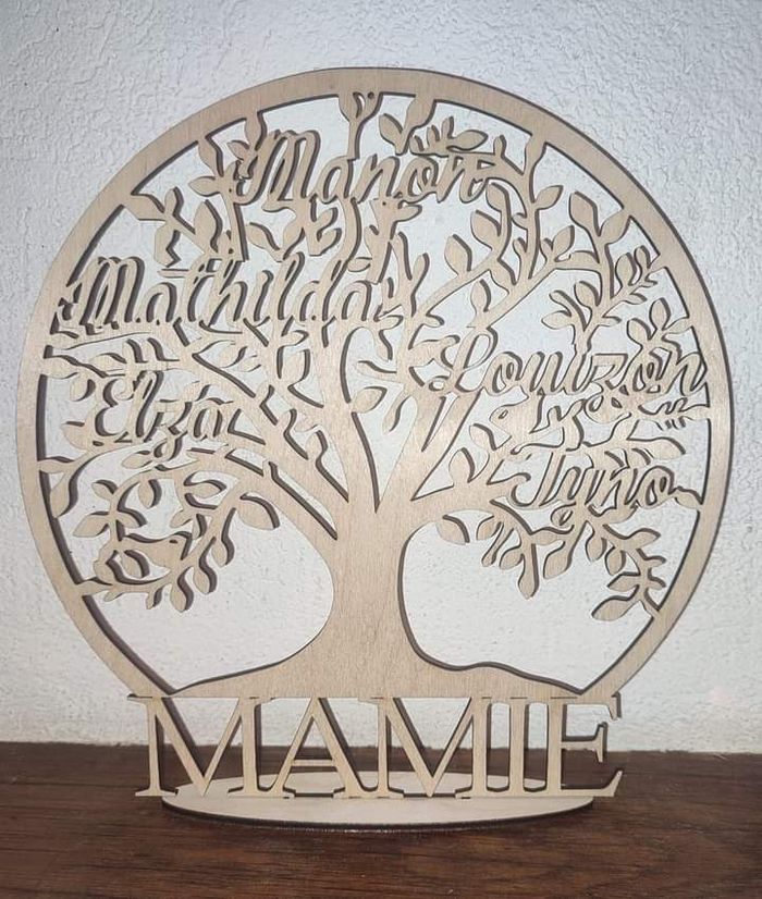 Arbre de vie en bois avec mamie en dessous (modifiable) ainsi que les prénoms dans les branches. Diamètre 20cm