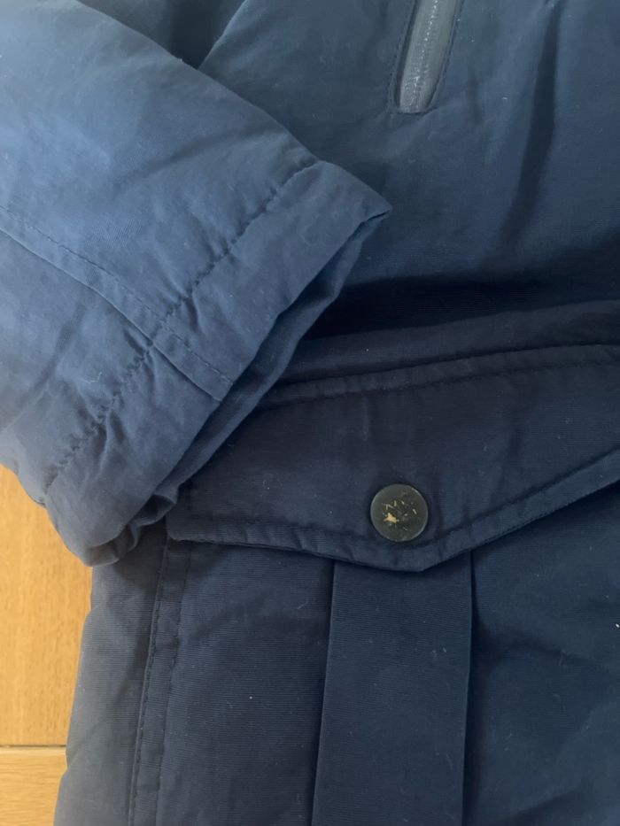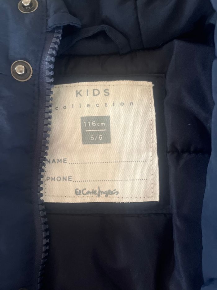 Parka bleu marine a capuche. La moumoute est amovible. Elle est en très bon état (qqs race sur les pressions) en taille 5-6 ans 116 cm de la marque el corte ingles. La fermeture fonctionne parfaitement Avec un bonnet