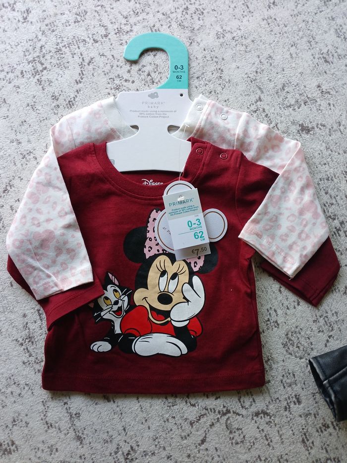 Ensemble d'une veste simili cuir et de deux t-shirts manches longues minnie . Envoie rapide et soigné .
