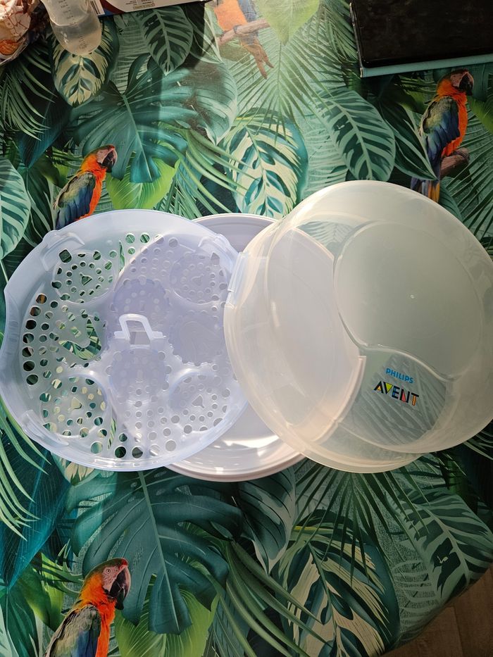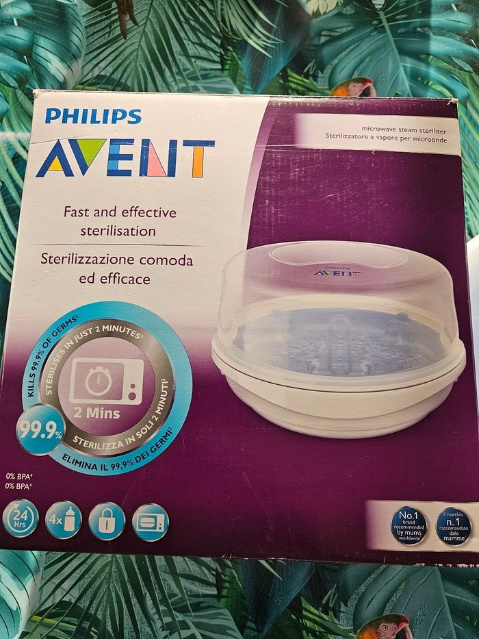 Vends sterilisateur micro-ondes à vapeur de la marque Philips avent Il est idéal pour une stérilisation rapide et efficace et pour vous accompagner n’importe où (chez vous ou en déplacement. Il convient à la plupart des micro-ondes sur le marché. Il vous permet de stériliser jusqu'à 4 biberons Philips Avent ou autres accessoires en même temps (tire-laits, sucettes, couverts...) afin d'éliminer 99,9 % des bactéries/microbes en 2 minutes. Caractéristiques : - Peut contenir 4 biberons Philips Avent mais aussi des tire-laits, sucettes, couverts... - Élimine 99,9 % des bactéries - Stérilise en 2 minutes - Contenu stérile jusqu'à 24 heures si le couvercle n'est pas soulevé - Stérilise les biberons à col standard et col large - Design léger pour stériliser vos biberons en déplacement - Convient à la plupart des micro-ondes sur le marché - Clips de sécurité froids pour maintenir le couvercle en place et permettant de retirer le stérilisateur du micro-ondes sans se brûler