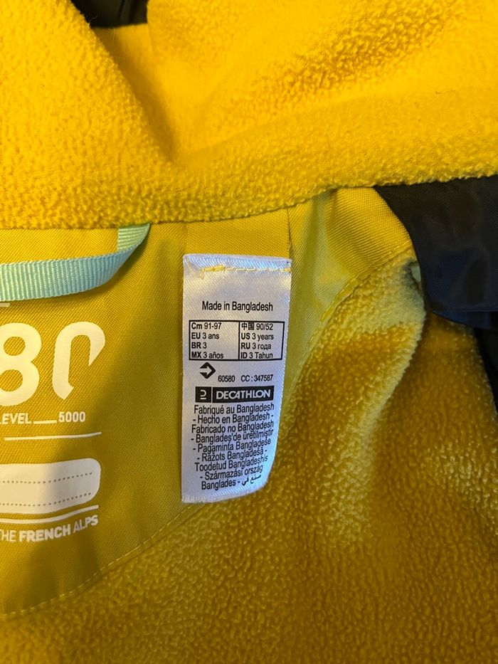 Blouson en très bon état, marque wedze, couleur jaune, taille 3 ans ou 91-97 cm, avec zip facile.