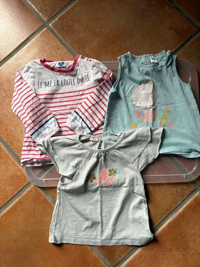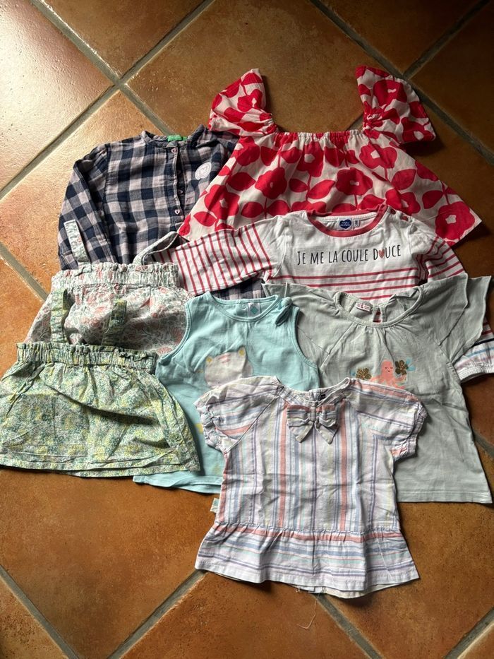 Lot de 5 tee shirts, 1 chemise united of benetton, 2 robes en très bon état. Plusieurs marques : mots d’enfants, tex, GEMO,chicappie…