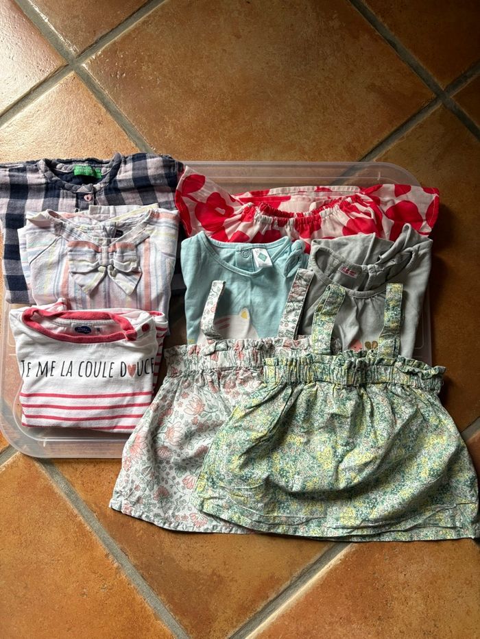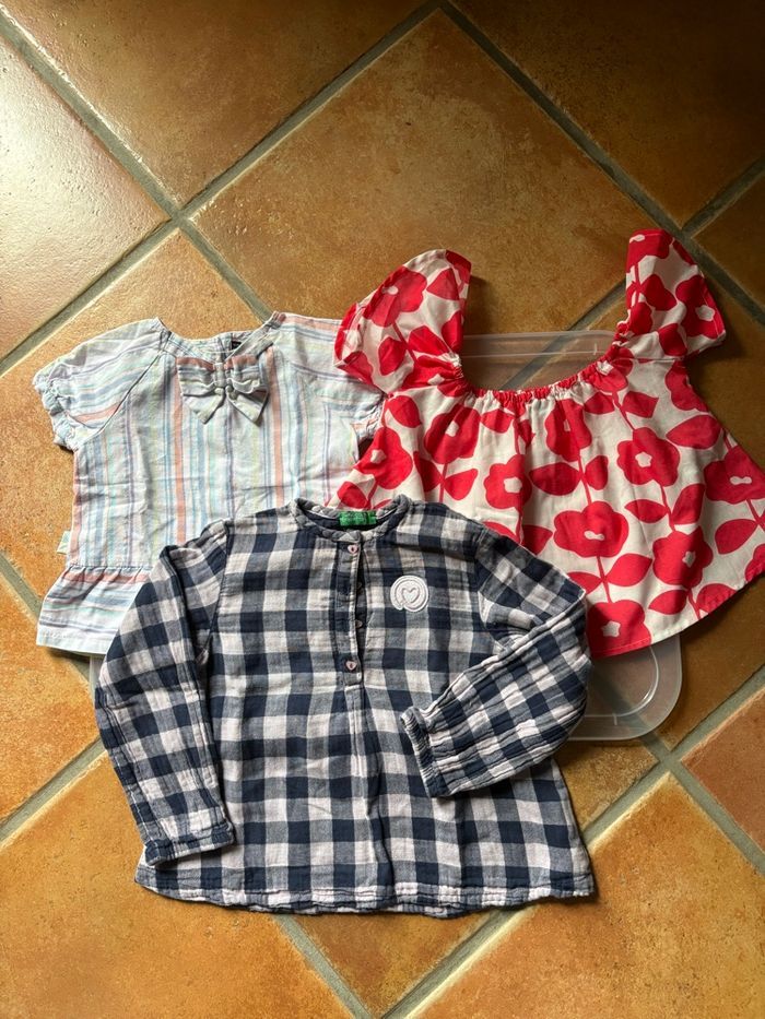 Lot de 5 tee shirts, 1 chemise united of benetton, 2 robes en très bon état. Plusieurs marques : mots d’enfants, tex, GEMO,chicappie…