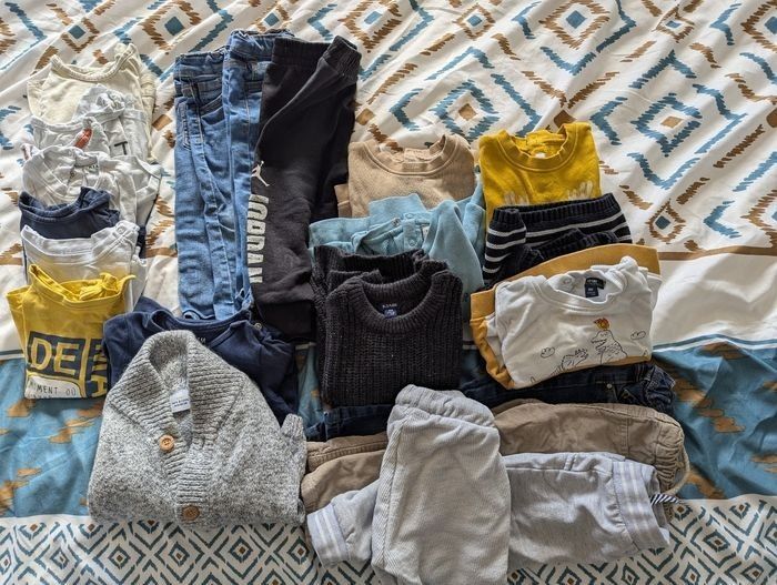 Lot vêtement 18 mois 7 teeshirt manches longues 1 gros gilet 1 body 3 jeans 3 jogging 1 pantalon 6 pulls