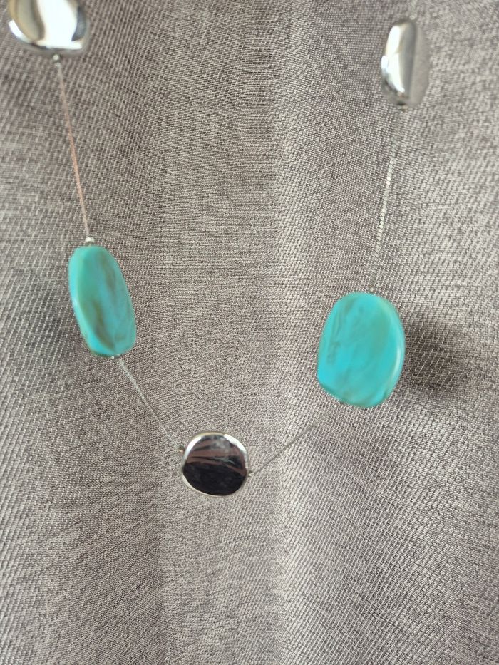 Magnifique collier long de type sautoir, parfait pour accessoiriser une tenue bohème ou estivale. ​Détails : Alternance de perles plates marbrées style turquoise et argentées à l'aspect brillant. ​Style : Chic, ethnique, vintage. ​État : Bon état, défauts sur 1 perle, voir photos. ​Dimensions : Longueur 40cm (idéal sur un pull fin ou une robe). ​Envoi : Rapide et soigné