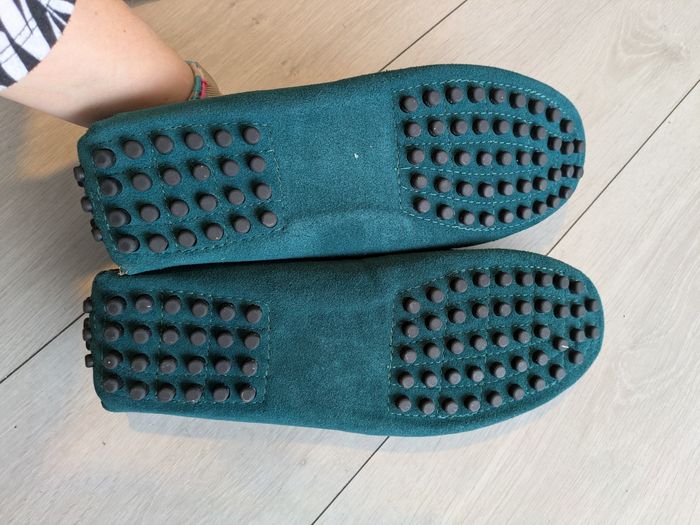 jolis mocassins d'été taille 49 neuf Bleu vert. Effet daim avec des picots caoutchouc en dessous. Chaussures hyper souples.