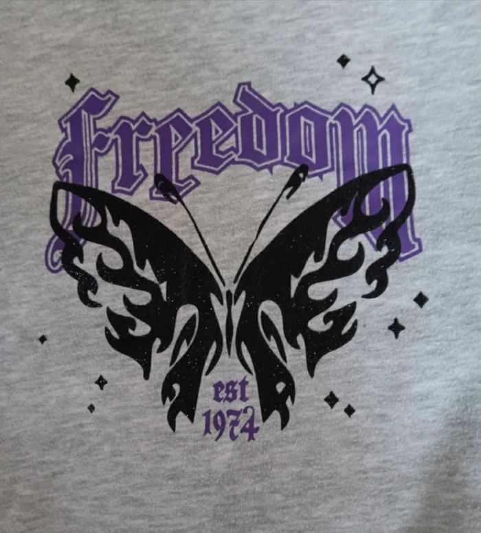 Très joli sweat-shirt gris clair chiné de la marque Primark, idéal pour un look décontracté avec une touche rock/Y2K. Design : Inscription "Freedom" en violet style gothique, grand papillon noir avec motifs de flammes et détails "est. 1974". Petites étoiles discrètes autour du motif. Composition : Mélange confortable (60% Coton / 40% Polyester). État : bon état général. Dimensions : Largeur 41 cm / Longueur 49 cm (bien vérifier les mesures car la taille indiquée est 9-10 ans / 140cm). Conseil d'entretien : Lavage à l'envers recommandé pour protéger le motif. Parfait pour l'école ou les sorties, très facile à assortir avec un jean ou un legging ! #skms62141_fille9ans #Primark #SweatFille #Freedom #Butterfly #Papillon #GothStyle #Y2K #ModeEnfant #GrisChiné #9ans