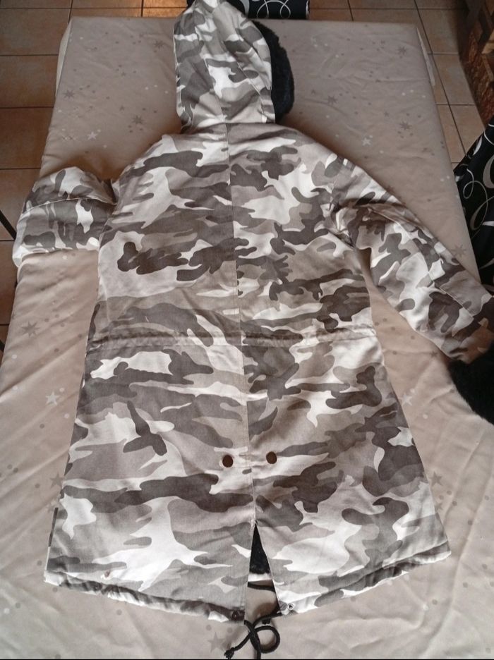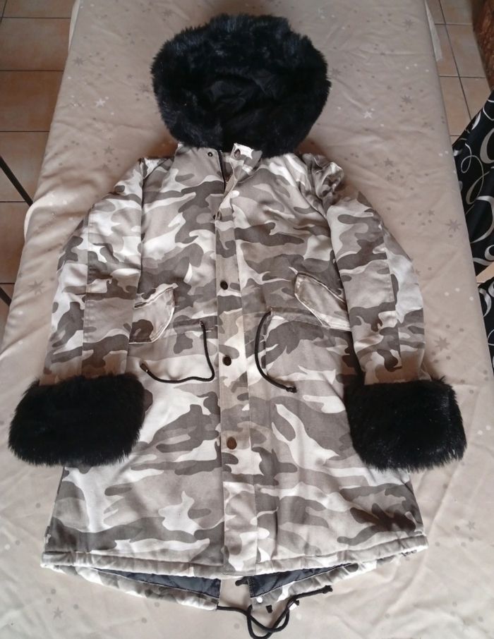 Manteau femme imprimé militaire avec fausse fourrure a l'intérieur sur le devant, la capuche et les manches.