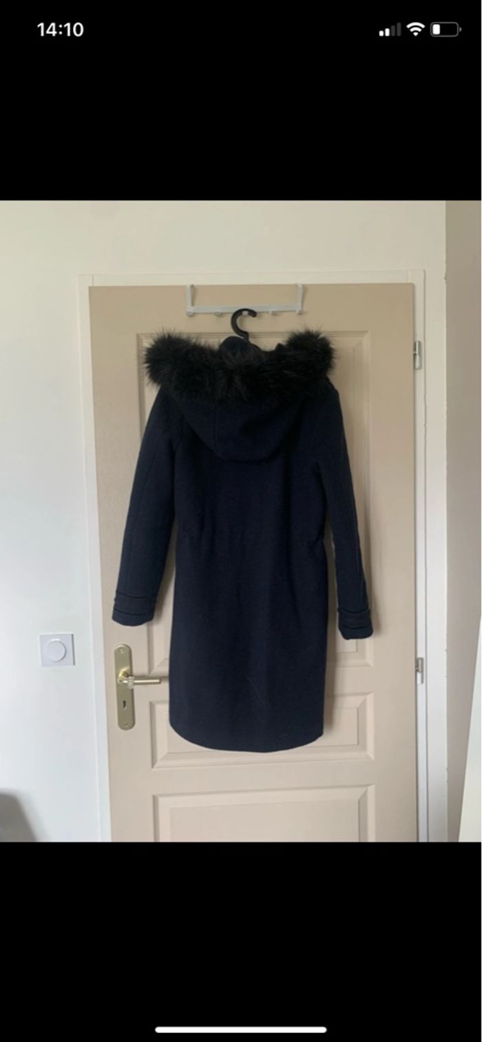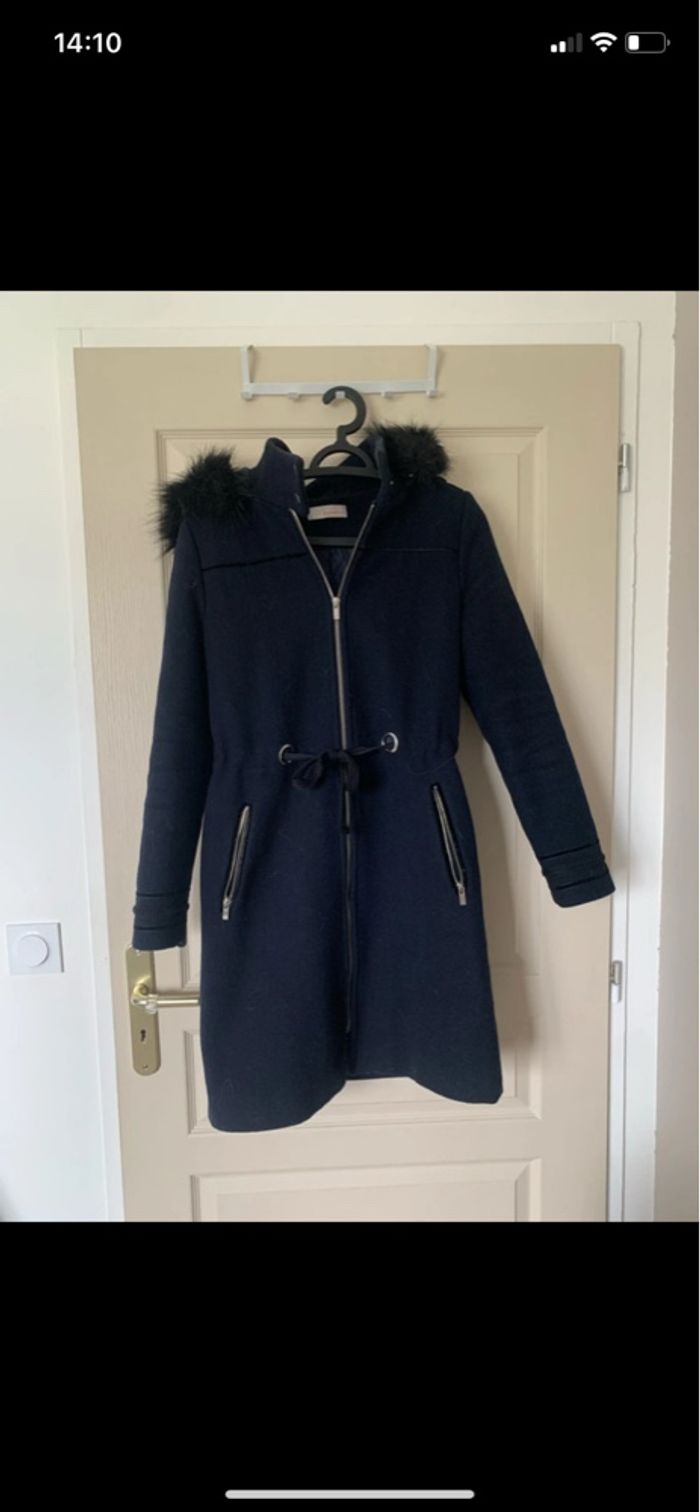 Beau manteau en laine couleur bleu marine. Marque Camaieu. Taille S. La fourrure peut se retirer