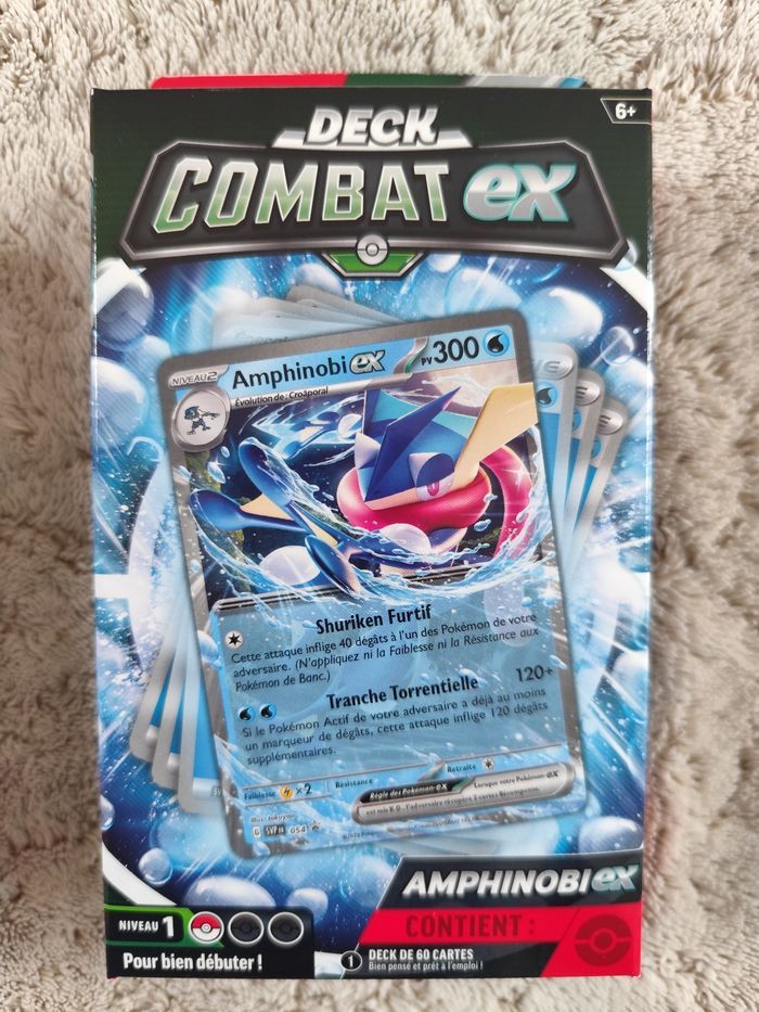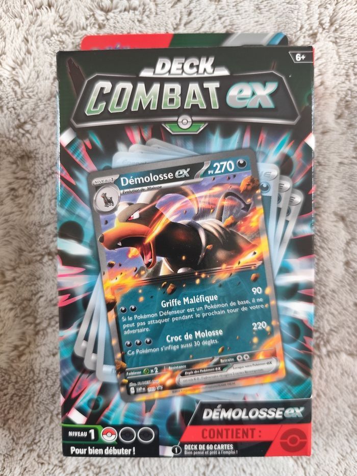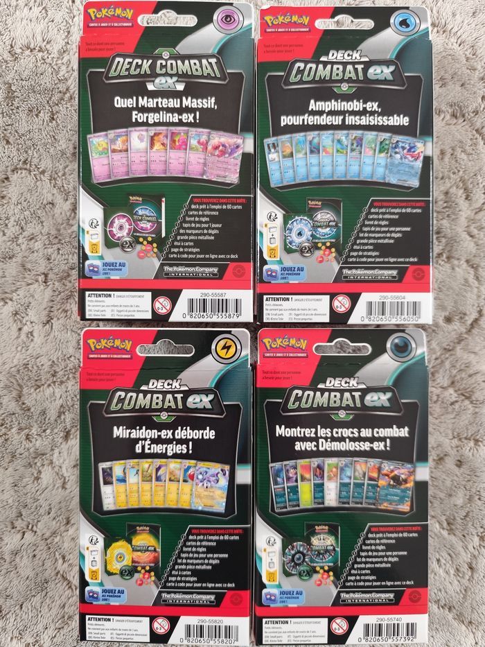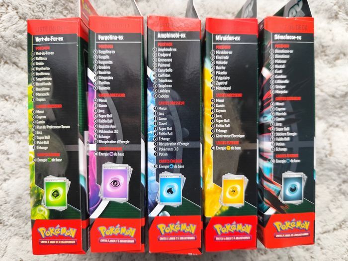 Deck Pokemon de 60 cartes chacun à 30€ les 4 ou 8€ l'unité au choix : - Démolosse - Miraidon - Frogelina - Amphinobi Contenu de chaque boîte : 1 deck prêt à l'emploi de 60 cartes 3 cartes de référence 1 livret de règles 1 tapis de jeu pour une personne 1 lot de marqueurs de dégâts 1 grande pièce métallisée 1 étui pour deck 1 page de stratégies 1 carte à code pour jouer en ligne avec ce deck 📦 Envoi rapide et soigné, prix non négociable Vert de fer n'est plus disponible