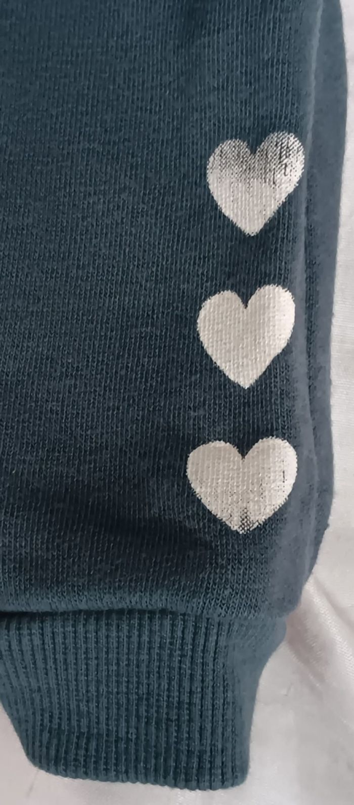 Adorable pantalon de jogging noir/anthracite de la marque Lupilu. Très confortable avec son intérieur "douillet", idéal pour la saison. Petit détail craquant : trois cœurs argentés pailletés en bas de la jambe. Taille : 86/92 (équivalent 18 - 24 mois) Dimensions exactes : Largeur taille : 24 cm Longueur totale : 49 cm Matière : 80% Coton / 20% Polyester (molleton doux État : bon état, pas de taches ni de trous. #skms62141_fille18mois #lupilu #jogging86 #jogging92 #pantalonbebefille #18mois #24mois #taille86 #taille92 #vêtementenfant #coeur