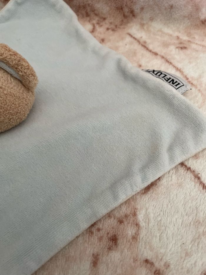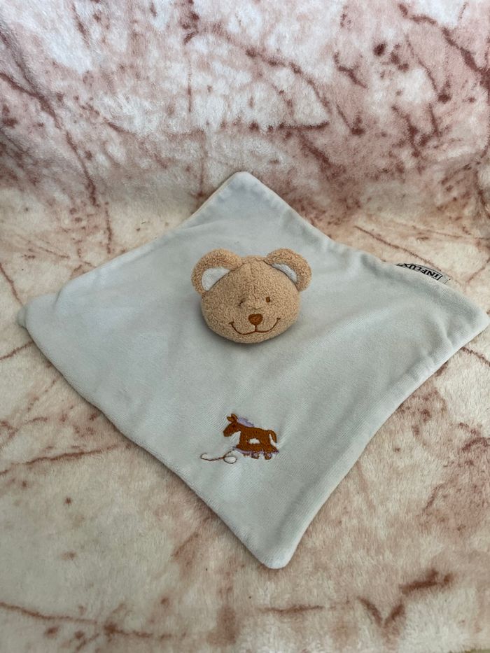 Doudou plat ours marron bleu et blanc au dos En broderie : un cheval en bois +/- 22cm Influx Occasion en bon état ( ⚠️ un tâche voir la photo ) Vous achetez le doudou que vous voyez sur la photo