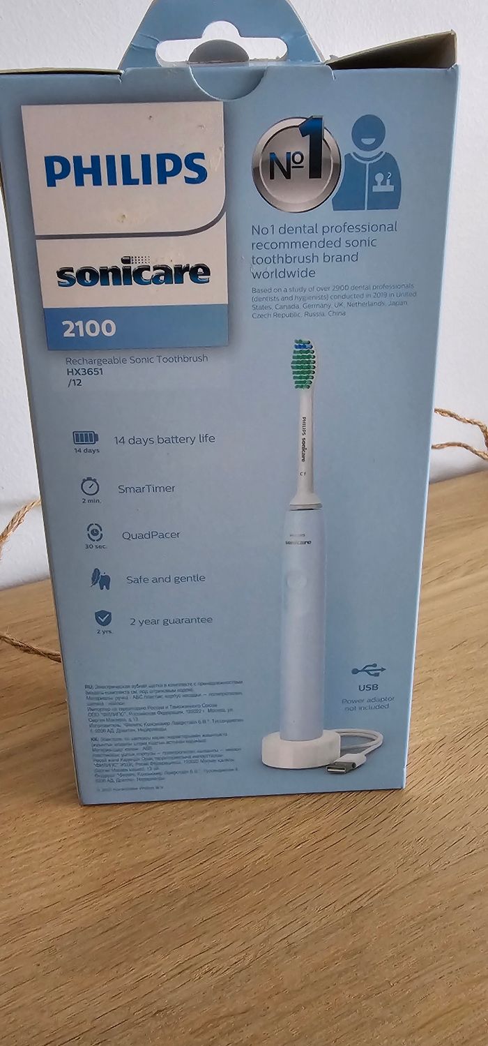 Brosse à dents électrique rechargeable Philips Sonicare modèle 2100- HX3651 /12. De couleur bleu ciel. Le coffret contient une brosse à dents électrique + une brossette et un câble de recharge USB. Envoi privilégié par Mondial Relay.
