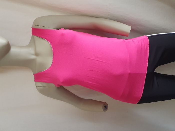 Débardeur rose avec fils argentés Fabriqué en Italie Taille unique : Mesures à plat Longueur des bretelles au bas : 60 cm Du décolleté au bas : 43 cm Largeur aisselles : 27 cm Poids : 85 grammes 95% viscose 5% élasthanne Comme neuf, portée 1 fois