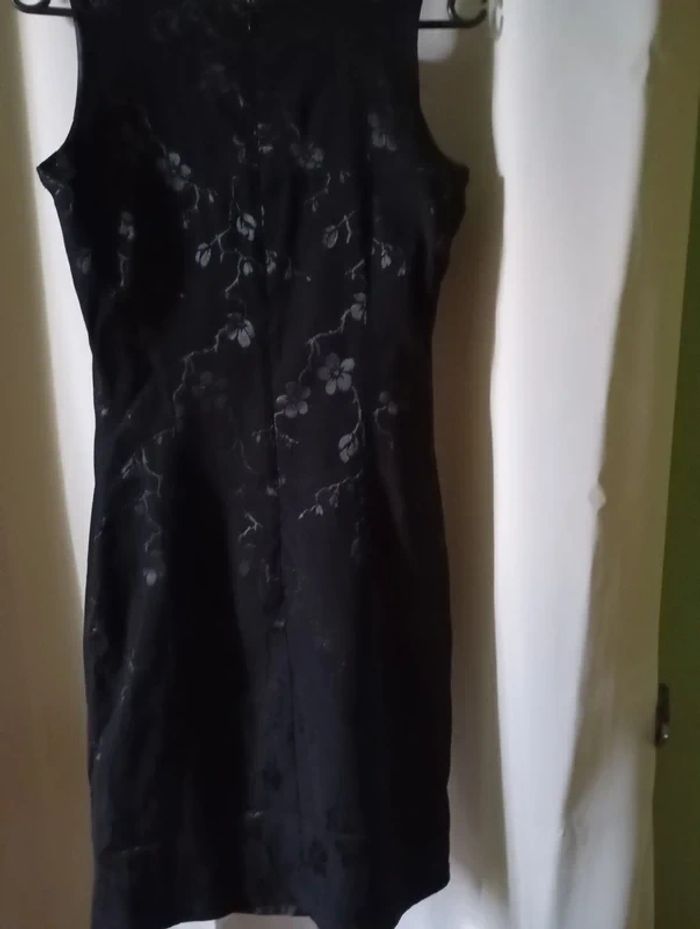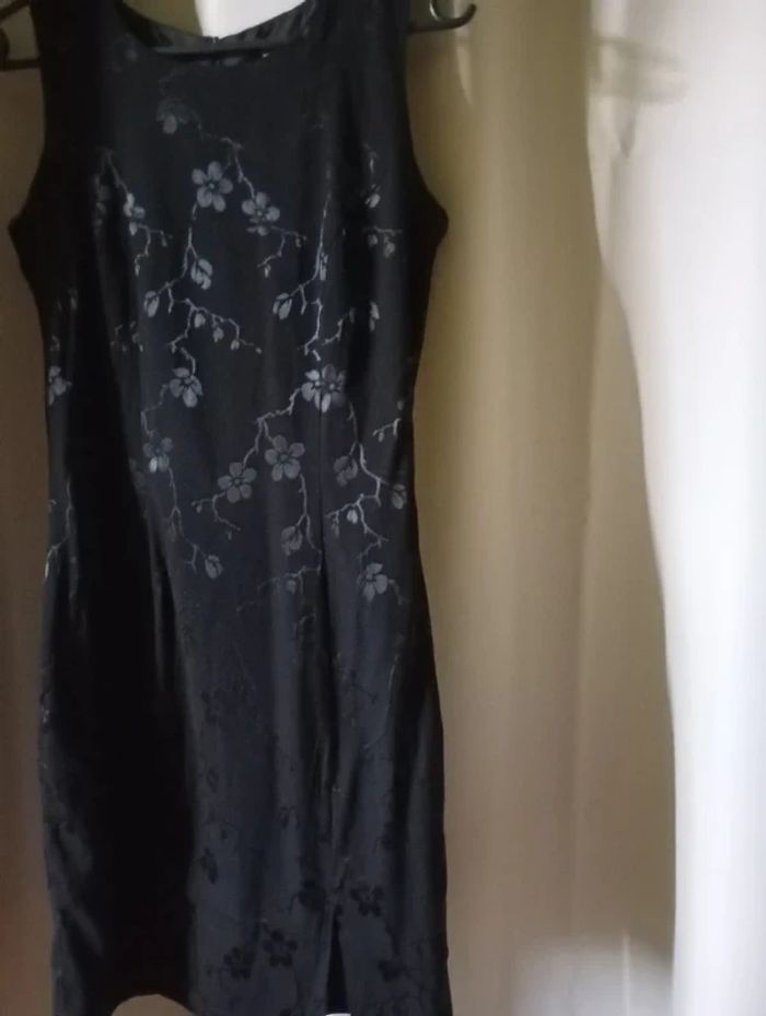 robe noire avec motifs à fleurs sans manches, se ferme au dos par une fermeture, une petite fente en bas devant cote gauche, la robe est doublée, ,n'a été porté que 2 soirées
