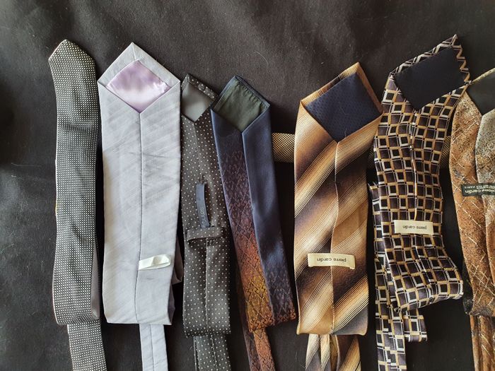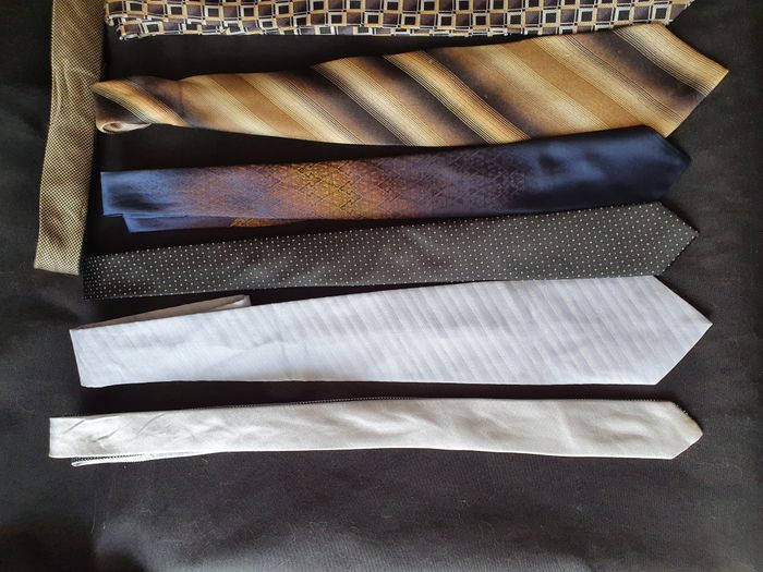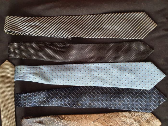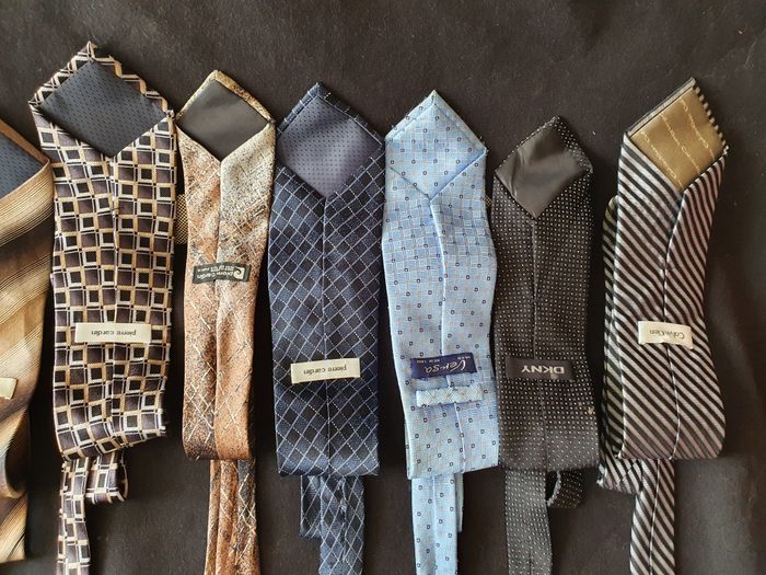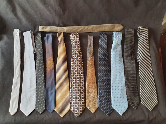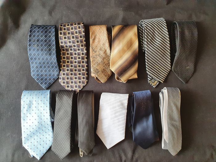 Lot de 12 cravates 4 Pierre Cardin 100% soie 1 Calvin Klein 100% soie 2 Jules 100% polyester 1 DKNY 100% soie 1 Versa Milan New York 100% soie 3 Divers Très bon état 3/4 auront besoin d'aller au pressing par conséquent j'offre un porte cravate