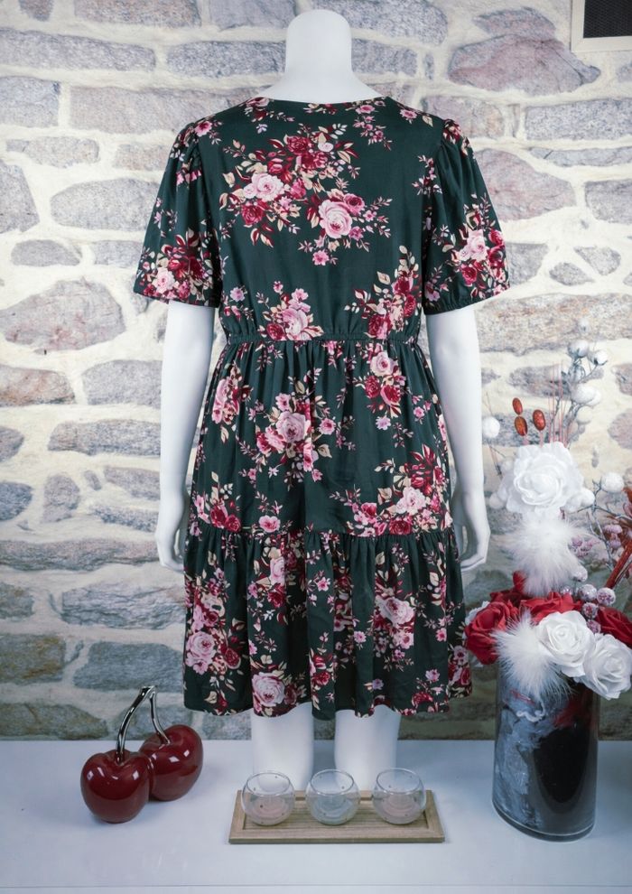 Robe jardin secret chic vert sapin Femme taille 54 marque Asos ✴️ Manches bouffantes ✴️Col mao ✴️ Décolleté en V ajustable par cing petits boutons ✴️ Taille élastiquée ✴️ Coupe fluide arborant un fond vert sapin profond est rehaussé d'un délicat imprimé floral, avec des roses aux nuances de rose poudré, de fuchsia et de rouge carmin, agrémentées de petites touches de crème et de beige ✴️ Composition -> 100 % polyester ✴️ Longueur => 102 centimètres ✴️ Mesure épaules à épaules => 45 centimètres ✴️ Tour de poitrine => 130 à 142 centimètres