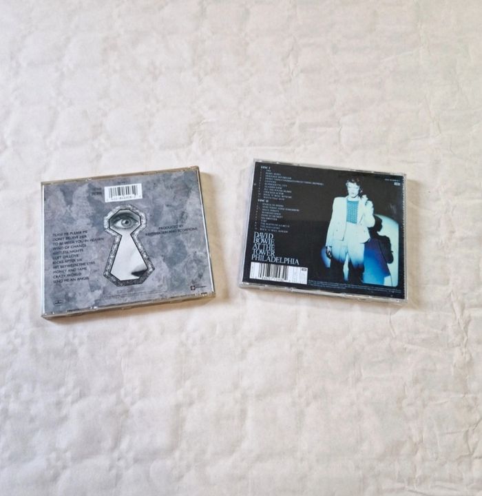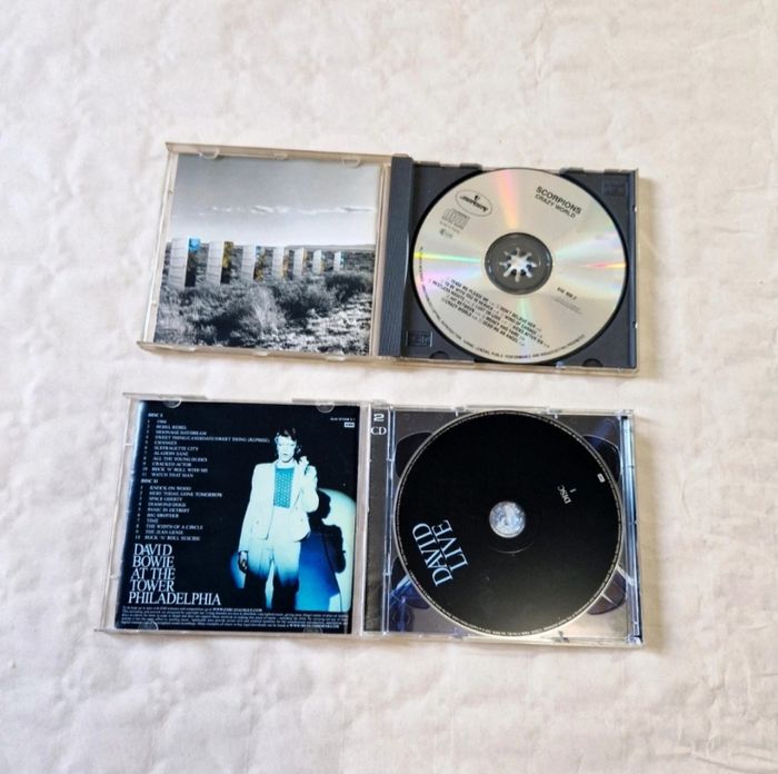 Bonjour. ​Lot de deux albums CD cultes : ​Scorpions - Crazy World : Complet (Boîtier + Livret + Disque). Le disque est propre, boîtier en bon état. ​David Bowie - David Live (At The Tower Philadelphia) : Complet (Boîtier + Livret + 2 Disques). Les disques présentent des micro-rayures, le boîtier est fonctionnel avec des traces d'usage normales. ​ #scorpions #davidbowie #rock #hardrock #cd #live