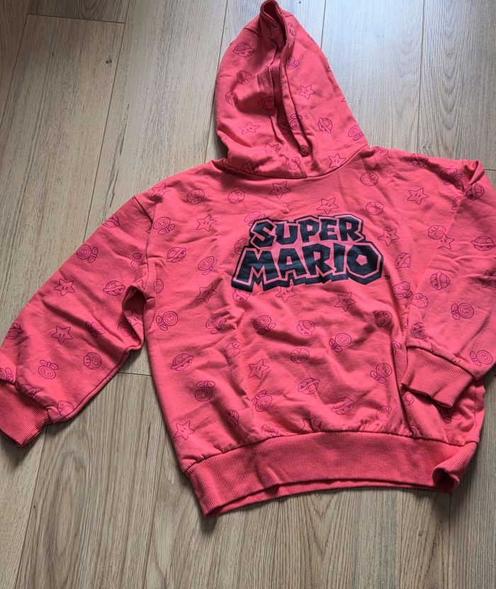 Lots de 2 jeans : 1 regular bleu foncé (Gémo), 1 skinny bleu clair (Kiabi) et 1 sweat-shirt à capuche rose Super Mario et impressions mauves petits symboles Super Mario. Les 2 jeans sont réglables à la taille (élastique et boutons).