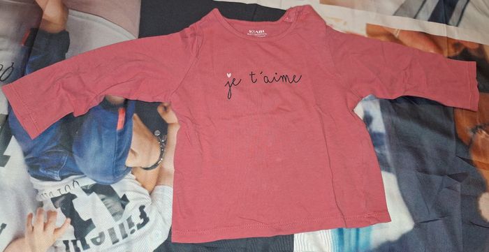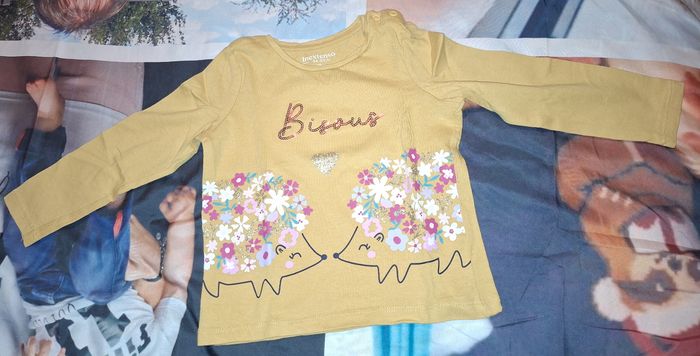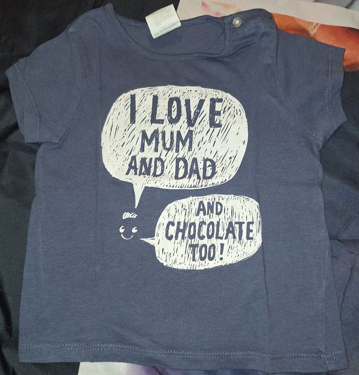 Lot de 3 Tee-shirts manches longues + 1 manches courtes : Un rose inscrit "Je t'aime" Marque Kiabi Un beige avec ronds noirs inscrit "Love" Marque Kiabi Un jaune avec des hérissons inscrit "Bisous" Marque In Extenso Un marine inscrit "I love mum and dad and chocolate too!" Marque Kiabi Taille 18 mois Très bon état