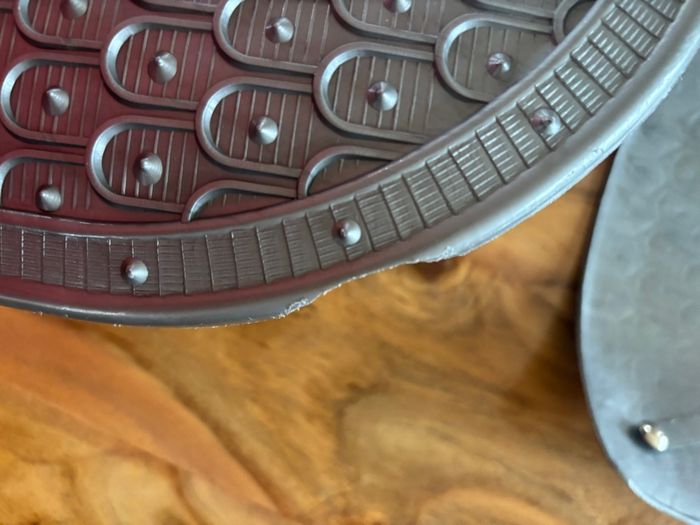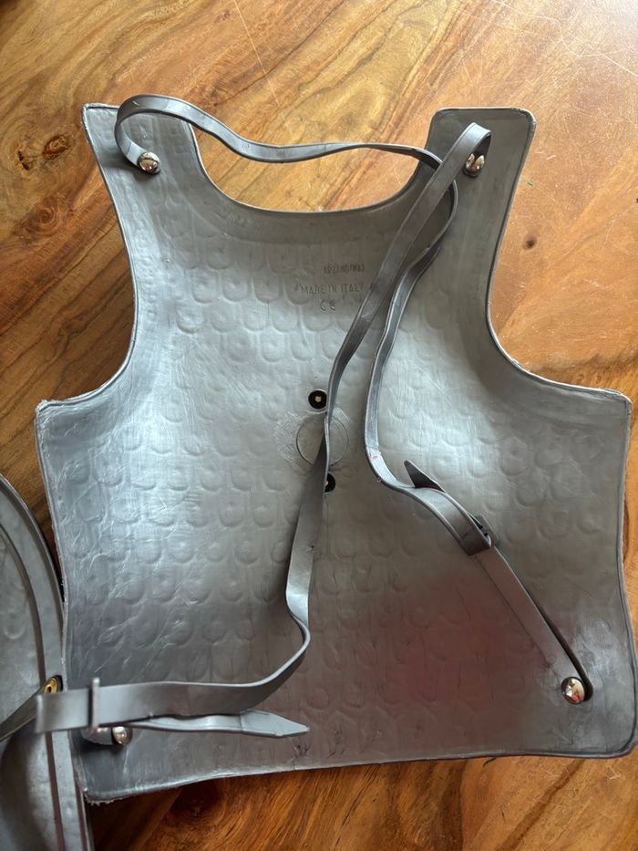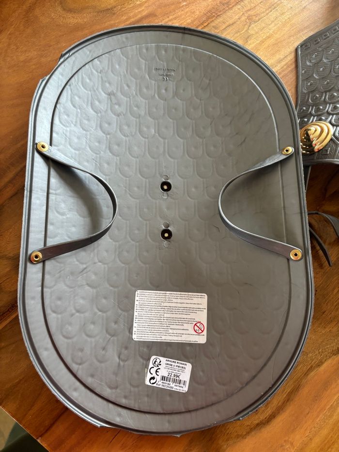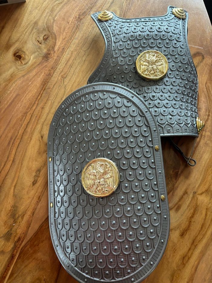 Cuirasse réglable , casque ( un peu cassé ) et bouclier ( esquinté sur le côté )