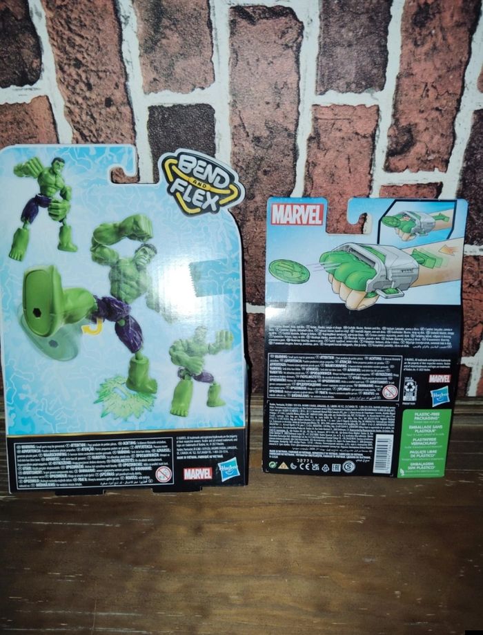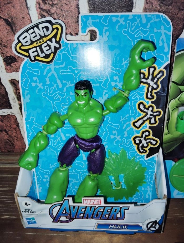Lot Marvel Hulk comprenant une figurine bend & Flex et un poing lanceur de disques. Neufs.