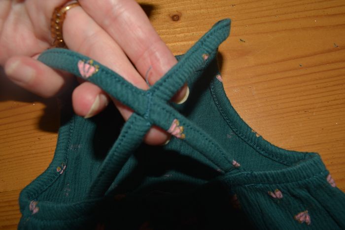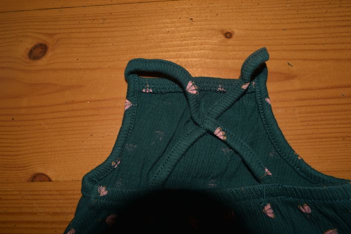 combinaison à bretelles verte dessin rose doré. bretelles dos croisée et cousue.