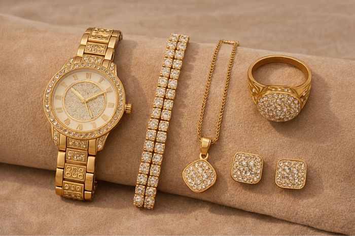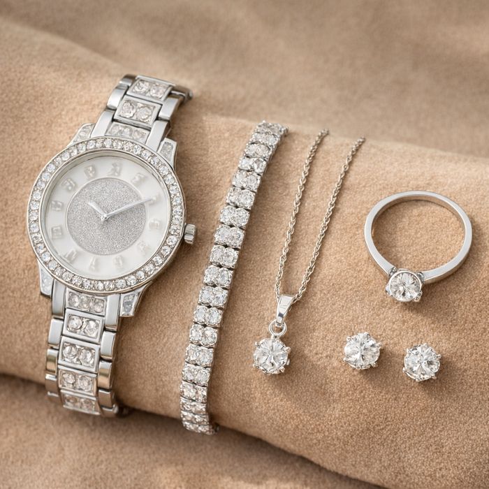 Un coffret comprenant 1 montre qui fonctionne à pile 1 bracelet 1 collier 1 paire de boucles d’oreilles 1 bague Le coffret est à 10€ Tout est neuf
