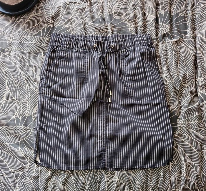 Fendu légèrement sur les côtés Taille élastique et liens de serrage Poches sur les côtés Jupe au dessus du genou Coton/ elasthanne Bleue et blanche N hésitez pas à regarder mes autres ventes pour regrouper vos achats et réduire vos frais de livraison