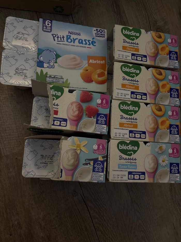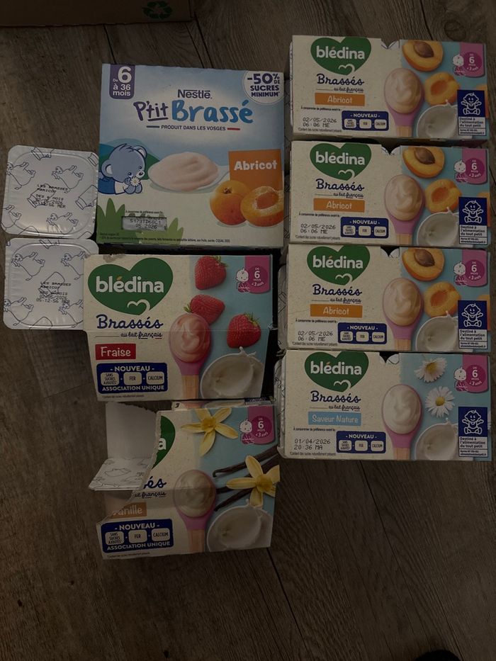 14 brassés abricot BLEDINA/ DLC : 02/05/2026 4 brassé abricot NESTLE / DLC : 05/2026 4 brassés nature / DLC : 01/04/2026 3 brassés vanille / DLC : 24/04/2026 3 brassés fraise / DLC : 24/04/2026
