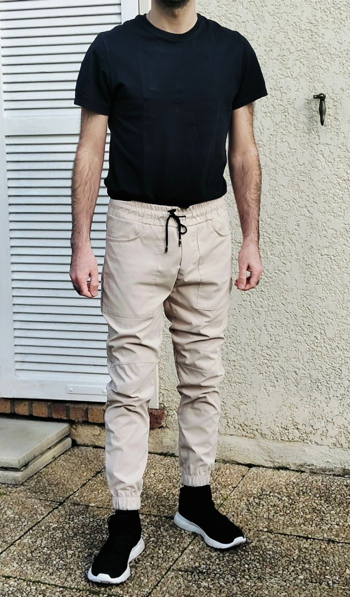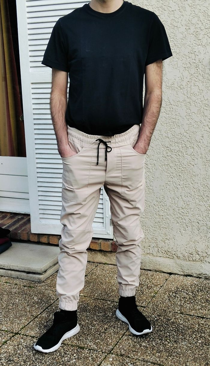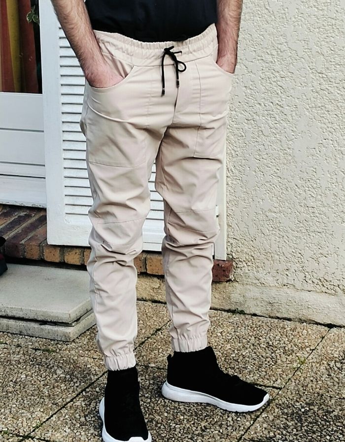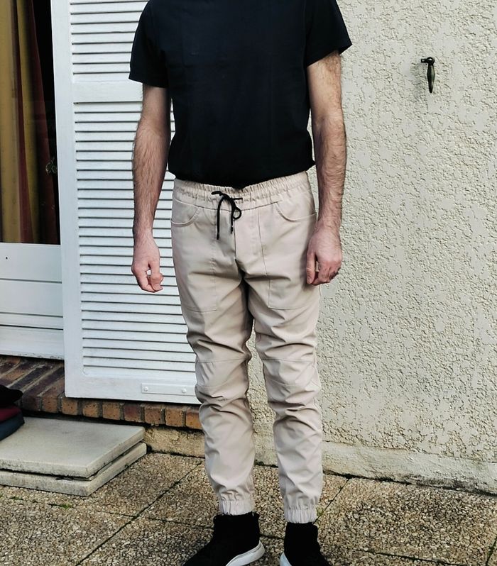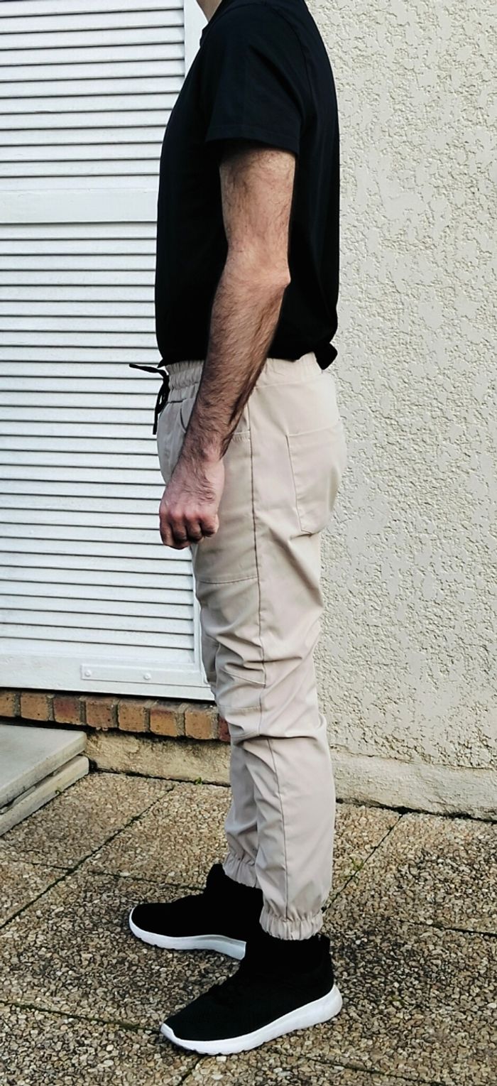 Pantalon cargo AARHON beige/crème de taille L (mais taille ajusté comme du M) en très bon état, peu porté. Chevilles resserrées et taille élastique avec cordon de serrage. Coton et polyester.