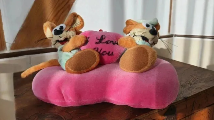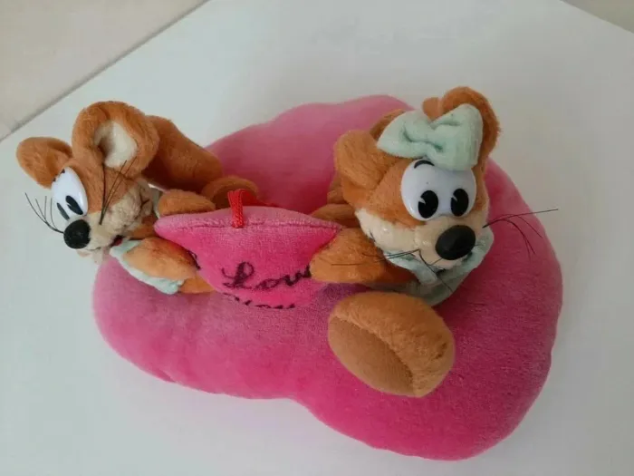 Idéal saint Valentin ou déclarer votre flamme Peluche cœur avec Mr et Mme souris Dimension à plat: largeur 22cm., profondeur 17 cm., hauteur 13cm.