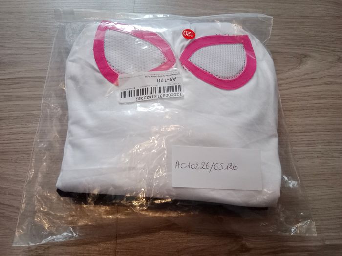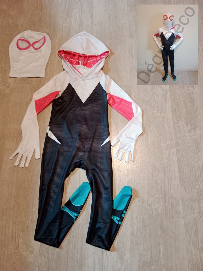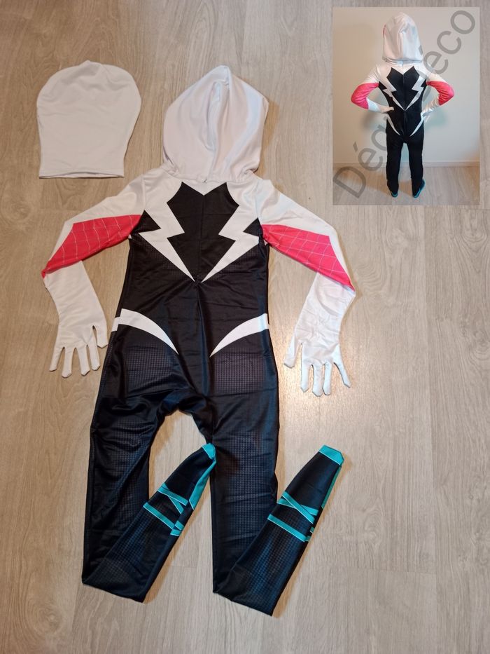 Costume inspiré de Ghost Spider, amie de Miles Morales dans le film d'animation Spiderman New generation. taille 120 (6 ans) Combinaison complète avec gants et pieds intégrés + cagoule. Fermeture dans le dos et derrière la capuche. Matière polyester et spandex. lavage en machine à 30. Pas de sèche linge, pas de repassage. Gwen Stacy, Spider girl...