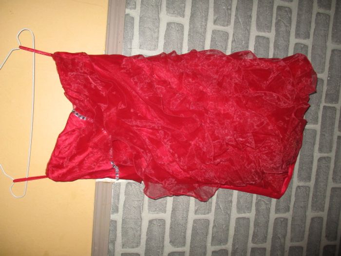Robe sans bretelle avec fermeture éclair sur le cotée taille 36 couleur rouge 70 de long 97 % polyester 3 % elasthanne ..sans marque⚠️Pas de photo portées⚠️