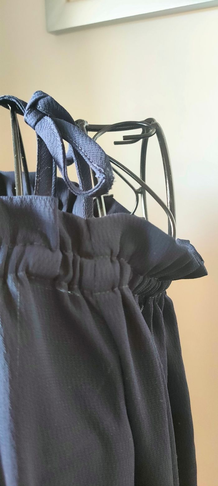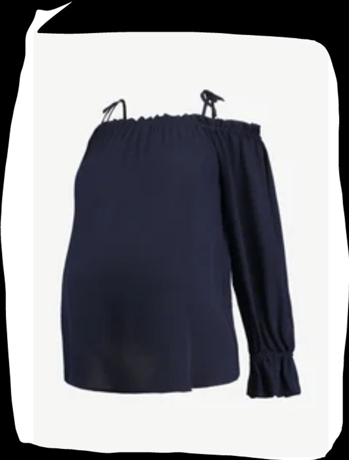 Haut col bardot avec attaches à nouer. Pas de défaut particulier à part une des attaches un peu usées. Bien que cela soit transparent, elle apporte une touche d'élégance et la matière est idéale pour un temps estival. Conçu pour femme enceinte et/ou convient très bien à une femme qui ne l'est pas aussi. Acheté environ 30 euros.