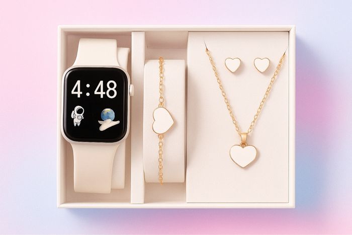 Le coffret de composant d'une montre son bracelet est en silicone elle affiche l'heure, le rythme cardiaque et le nombre de pas. Fonctionne à pile. Dans le coffret il y a la montre + collier + bracelet+ boucle d'oreilles 15€ le coffret Neuf