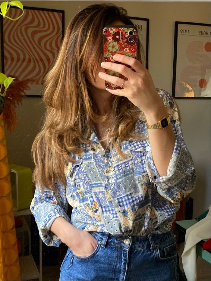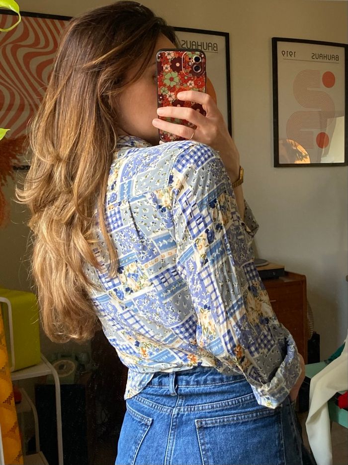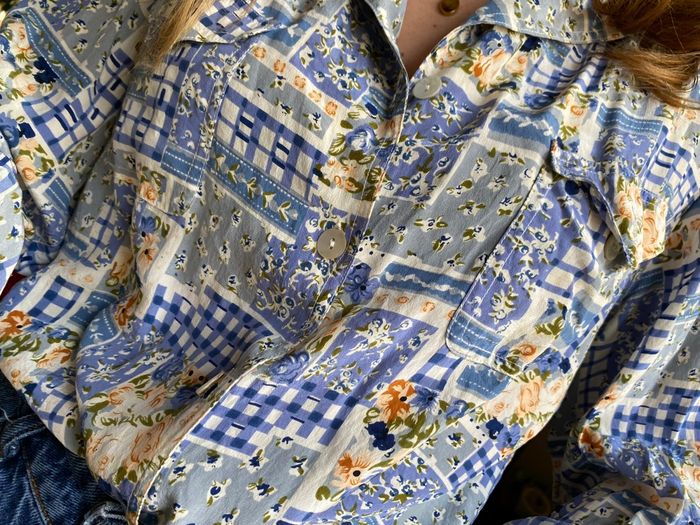 Très jolie chemise vintage à imprimé patchwork, dans des tons de bleu, crème et beige, avec des motifs floraux et carreaux délicats. ✨ Détails : • Motif patchwork floral et carreaux • Couleurs : bleu, crème, touches beige • Coupe droite, légèrement ample • Manches longues • Tissu fluide et confortable 🕰 Époque estimée : 👉 Années 90 – début 2000 🎯 Style : Vintage campagne / cottagecore / casual rétro Taille indiquée : 48, mais correspond à un 38 (M) oversize 100% SOIE ITALIENNE Très bon état vintage #chemisevintage #patchwork #cottagecore #vintagestyle #chemisefleurie #slowfashion #secondevie #chemisesoie #soievintage