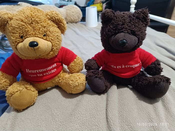 Lot de deux peluches avec message "tu es à croquer !" Et "heureusement que tu existes", en bon état