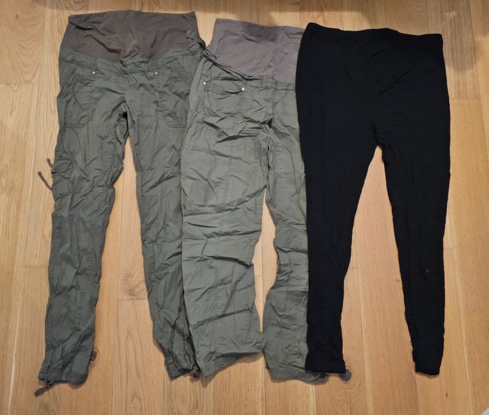 Ce lot taille 40 est composé: - 2 pantalons gris et noir h et m mama - 1 legging new look maternite - 2 pantalons kaki dont 1 à taille reserrable Bon etat