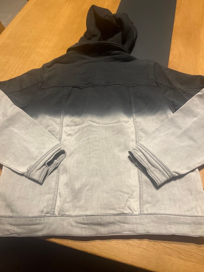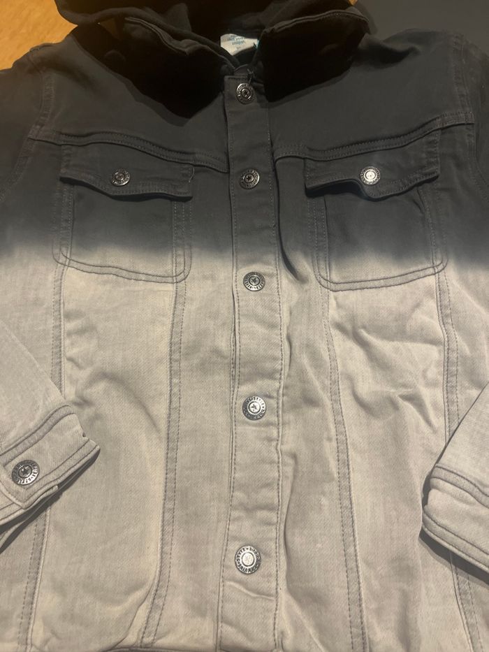 Veste en jean avec capuche amovible. Elle a une très jolie couleur allant du gris vers le noir. Marque boboli en taille 10 ans. Portée 3 fois grand max