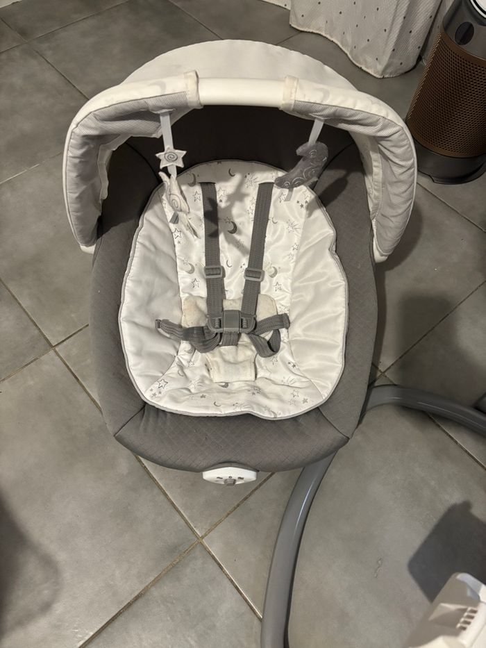 Transat Balancelle Joie Serina 2-in-1 – Starry Night – Très bon état Je vends un transat / balancelle Joie Serina 2-in-1 coloris Starry Night (blanc, gris, étoiles et lunes) en très bon état. Modèle très pratique qui combine balancelle électrique et transat détachable pour s’adapter à tous les moments de la journée. ✨ Caractéristiques : 🔹 Balancelle (fonctionne sur secteur) • 2 sens de balancement : avant/arrière ou gauche/droite • Plusieurs vitesses • Musiques et sons de la nature • Idéale pour apaiser et endormir bébé 🔹 Transat amovible (fonctionne à piles) • Se détache facilement de la structure • Fonction vibrations apaisantes • Léger et pratique pour déplacer bébé dans la maison 🔹 Autres équipements • Arche de jeux avec peluches • Dossier inclinable • Assise confortable • Housse déhoussable et lavable 🍼 État Très bon état, propre et bien entretenu. Maison non-fumeur. Nécessité un lavage pour la seconde main Parfait dès la naissance pour calmer bébé, l’occuper ou l’avoir près de vous en toute sécurité. 📩 N’hésitez pas à me contacter pour plus d’infos ou des photos supplémentaires ! Récupère sur place