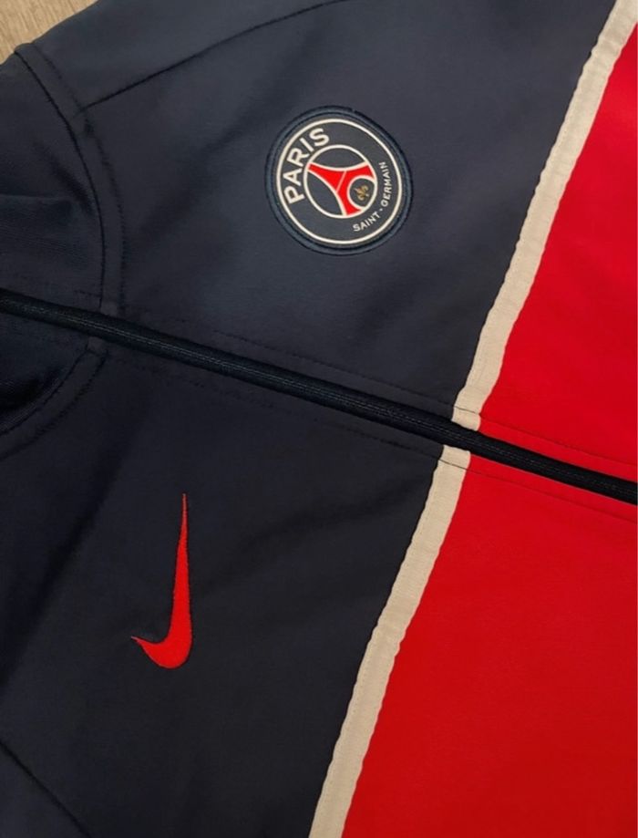 Veste de survêtement officielle du Paris Saint-Germain, signée Nike. Couleurs : bleu marine, rouge et blanc Logo PSG brodé + logo Nike rouge Fermeture éclair sur toute la longueur Deux poches zippées pratiques Etat : excellent, très peu portée Idéale pour les fans du PSG ou pour un look sportif et stylé ! #paris #psg #football #kid