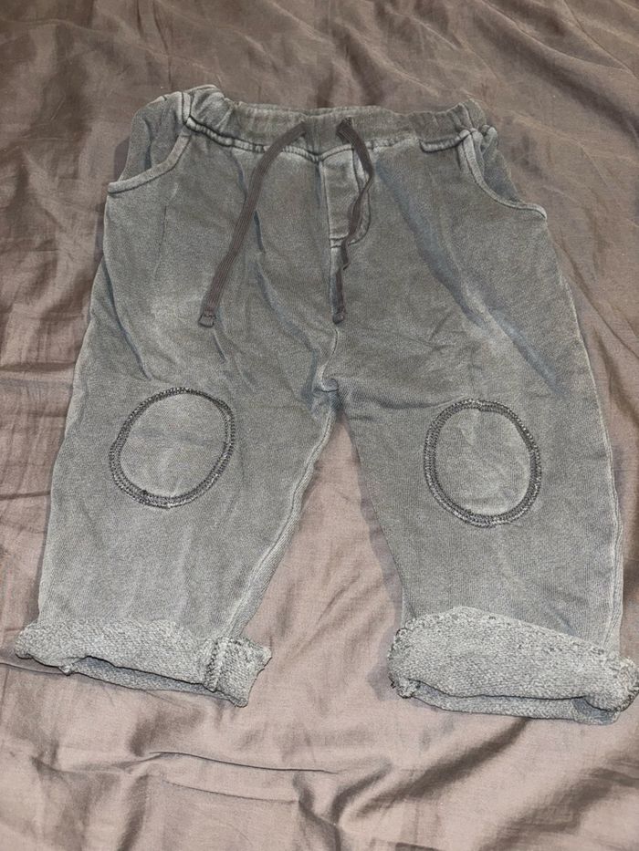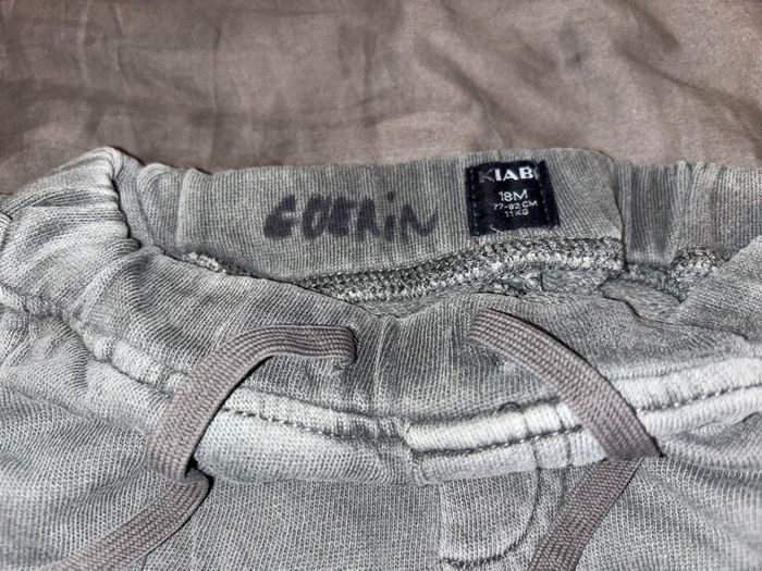 Pantalon gris avec un prénom écrit au marqueur à l’intérieur